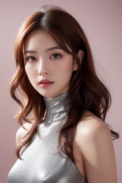 (photorealistic:1.4),deep shadow,reflection light,cinematic light,studio light,1girl,solo,upper body,red hair,wavy hair,long hair,brown eyes,looking at viewer,medium breasts,unitard,dress,depth of field,close-up,( chiaroscuro,Fujicolor, UHD, super detail ,raw,85mm,f/1.2,FujifilmXT4,),simple background,Pastel Red,a colorful background,