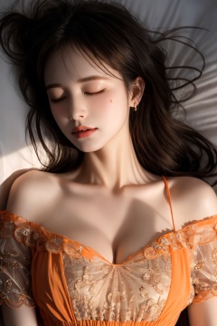 XHC sleep,1girl,solo,closed eyes,realistic,lying,dress,(light orange dress:1.4),bare shoulders,breasts,on back,pillow,lips,long hair,sleeping,brown hair,collarbone,black hair,closed mouth,off shoulder,cleavage,short sleeves,nose,bed sheet,soft light,(see-through:1.3),epic realistic,(dark shot:1.5),(darkness:1.5),(soft light:1.2),(breast:1.3),(cleavage:1.3),<lora:XHC soft light_20240716125739-000018:0.8>,(masterpiece, top quality, best quality, official art, beautiful and aesthetic:1.2),natural skin texture,high detailed skin,(detailed skin:1.5),photorealistic,extreme detail,lifelike,crisp,precise,35mm photograph,film,bokeh,professional,highly detailed, <lora:XHC soft light_20240716125739:0.5>