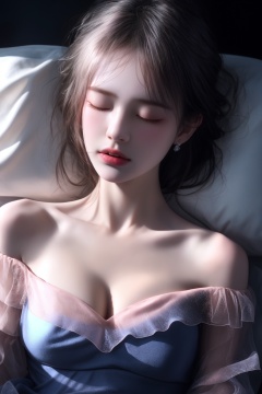 (Realistic, Hyperrealistic: 1.1)XHC sleep,1girl,solo,sleeping,lying,Silver hair,closed eyes,on back,bare shoulders,pillow,collarbone,off shoulder,tongue,short hair,realistic,soft light,(Klein Blue and Light Pink dress:1.3),(see-through:1.3),epic realistic,(dark shot:1.5),(darkness:1.5),(soft light:1.2),(breast:1.3),(cleavage:1.3),<lora:XHC soft light_20240716125739-000018:0.9>,(masterpiece, top quality, best quality, official art, beautiful and aesthetic:1.2),natural skin texture,high detailed skin,(detailed skin:1.5),photorealistic,extreme detail,lifelike,crisp,precise,35mm photograph,film,bokeh,professional,highly detailed, <lora:XHC soft light_20240716125739:0.5>