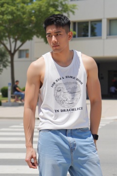 jzns,biu,1man,asian,solo, male focus,handsome, bag, white tanktop,jeans, outdoors, print shirt,street,sunny,magnificent,,masterpiece, realistic, best quality, highly detailed,