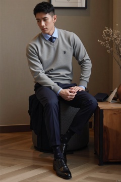 jzns, 1man,fashion model,asian,exquisite facial features,handsome,Business fashion,wearing sweater,shirt,pants,dark Pattern socks,Oxford style footwear,sitting,full body,indoors, natural  Lighting,magnificent,,masterpiece, realistic, best quality, highly detailed,biu