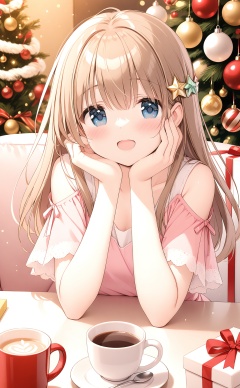 masterpiece,best quality,high quality,(colorful),1girl,christmas_tree,solo,gift,pink_shirt,blush,cup,gift_box,christmas,smile,long_hair,looking_at_viewer,shirt,hair_ornament,christmas_ornaments,blue_eyes,hair_between_eyes,box,open_mouth,mug,:d,brown_hair,short_sleeves,upper_body,head_rest,collarbone,hands_up,food,shoulder_cutout,
