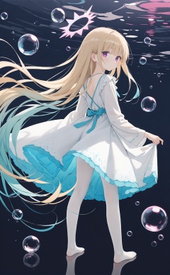 masterpiece,best quality,high quality,(colorful),artist Alens,Artist torino aqua,Artist\:ciloranko,Artist hiten \(hitenkei\),artist wlop,artist tianliangduohefangdongye,loli,1girl,solo,long hair,halo,dress,white dress,very long hair,absurdly long hair,full body,looking at viewer,multicolored hair,colored skin,liquid hair,long sleeves,looking back,wide sleeves,purple eyes,white pantyhose,barefoot,soles,blonde hair,from behind,pantyhose,blue hair,gradient hair,standing,pink eyes,aqua hair,expressionless,white skin,grey hair,water,floating hair,bubble,two-sided fabric,short dress,green skin,