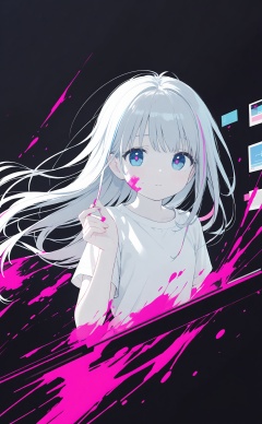 masterpiece,best quality,high quality,(colorful),artist Alens,Artist\:ciloranko,Artist hiten \(hitenkei\),artist wlop,artist tianliangduohefangdongye,loli,1girl,solo,pink blood,blue eyes,upper body,white hair,long hair,shirt,multicolored hair,blue hair,looking at viewer,closed mouth,blood,floating hair,white shirt,holographic interface,hand up,colored skin,paint splatter,white skin,window (computing),liquid,paint splatter on face,holographic monitor,pink hair,short sleeves,parted bangs,hair intakes,long sleeves,blood on face,black background,expressionless,glitch,pink pupils,streaked hair,pale skin,