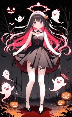 masterpiece,best quality,high quality,(colorful),loli,1girl,long hair,dress,halo,ghost,black dress,jack-o'-lantern,black hair,torn clothes,solo,pumpkin,pink eyes,halloween,spot color,blood,looking at viewer,red halo,torn dress,floating hair,cross,very long hair,full body,sleeveless dress,sleeveless,red eyes,detached collar,glowing,bare shoulders,glowing eyes,standing,