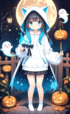 masterpiece,best quality,high quality,(colorful),loli,1girl,hood,lantern,blue fire,skirt,holding,holding lantern,jack-o'-lantern,blue eyes,black skirt,solo,fire,hoodie,white hoodie,pleated skirt,black hair,looking at viewer,pumpkin,candle,moon,hood up,long sleeves,full body,multicolored hair,halloween,two-sided fabric,blue hair,closed mouth,white socks,ghost,socks,glowing,colored inner hair,animal hood,sidelocks,crescent,hitodama,halftone,full moon,barefoot,blunt bangs,puffy long sleeves,expressionless,miniskirt,long hair,star (symbol),