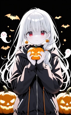 masterpiece,best quality,high quality,(colorful),loli,1girl,red eyes,jacket,black jacket,jack-o'-lantern,ghost,white hair,jewelry,earrings,solo,upper body,black shirt,looking at viewer,hood,long hair,long sleeves,holding,closed mouth,shirt,pumpkin,vegetable,open jacket,hooded jacket,hood down,open clothes,shaded face,holding vegetable,turtleneck,hands up,hair over shoulder,black background,glowing,pale skin,food,zipper,halloween,holding food,