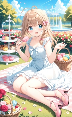 masterpiece,best quality,high quality,(colorful),loli,1girl,solo,outdoors,dress,white dress,flower,smile,long hair,braid,blue eyes,pink flower,day,:d,food,open mouth,high heels,looking at viewer,holding,blush,hair bow,rose,bow,pink rose,pink bow,collarbone,book,pink footwear,sky,cloud,brown hair,petals,birdcage,white flower,sleeveless dress,breasts,sleeveless,macaron,picnic,blue sky,holding food,bare shoulders,yellow flower,grass,cage,small breasts,hair ornament,fountain,tiered tray,basket,antenna hair,single braid,red flower,bare arms,