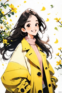 1girl,long hair,flying hair,pink sweater,yellow overcoat,smile,delicate facial features,simple background,bloom cheer,best quality,great work,extreme details,16k,highres,