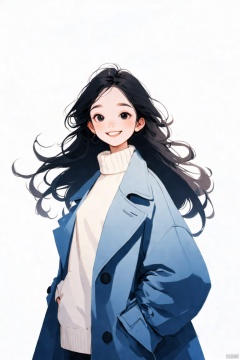 Against a soft, cream-colored backdrop, a young girl with luscious long hair stands out in stunning detail. Her flowing locks appear to be defying gravity as she wears a crisp white sweater and a stylish blue overcoat that drapes elegantly across her upper body. A radiant smile illuminates her delicate facial features, drawing the viewer's attention. The overall atmosphere is serene, with a subtle bloom of cheer emanating from the scene. Rendered in exceptional 16k high-resolution quality, every detail shines with great workmanship.