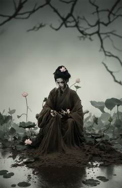 score_9,score_8_up,score_7_up,score_6_up,score_5_up,xiexinghanfu, a figure dressed in traditional Chinese attire, sits amidst a desolate setting. The clothes are tattered and covered in mud, suggesting a journey through harsh conditions. In the figure's hands, a delicate lotus flower introduces a contrasting element of purity and beauty amidst the decay. The backdrop of twisted branches and a bleak landscape further accentuates the resilience symbolized by the lotus.