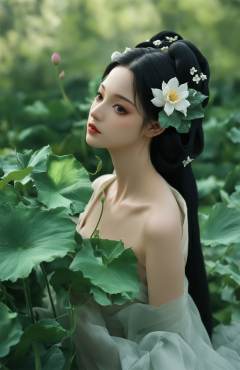 score_9,score_8_up,score_7_up,score_6_up,score_5_up,xiexinghanfu,In a tranquil pond dotted with lotus leaves,a figure clad in traditional Chinese attire emerges,her graceful posture reflecting the elegance of ancient beauty rituals. Her hair,adorned with floral accessories,cascades amidst the greenery,blending with nature's palette. The scene is a harmonious symphony of tradition and nature,capturing a moment of serene contemplation.,