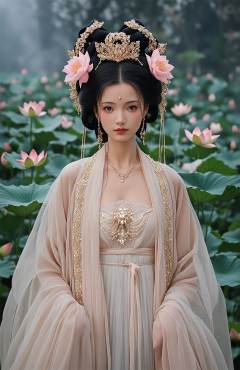 score_9,score_8_up,score_7_up,score_6_up,score_5_up,Hanfu, a traditional Chinese garment, is depicted in this image. The individual is adorned in a flowing robe with delicate embroidery and intricate details, showcasing the beauty and craftsmanship of traditional Chinese textile design. The fabric appears to be of a sheer, lightweight material, allowing a glimpse of the skin beneath and adding to the ethereal quality of the attire. The robe is complemented by an ornate headdress, rich with floral and foliage motifs, further emphasizing the cultural significance of nature in Chinese aesthetics. The setting is completed with the presence of lotus flowers, a symbol of purity and enlightenment in Chinese culture, which are often associated with the beauty and elegance of traditional Chinese women's attire.