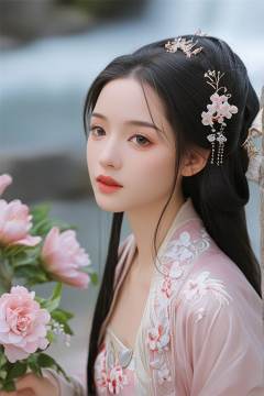 score_9,score_8_up,score_7_up,score_6_up,score_5_up,score_4_up,In ancient China, women were dressed in exquisite and elegant Hanfu embroidered with delicate patterns. The clothes swayed in the wind, and her long hair was like a waterfall. She tied it up with a classical hairpin, had a straight face, cherry lips, fair and delicate skin, and a gentle and elegant temperament. She stood elegantly surrounded by flowers, with an overall elegant color tone.