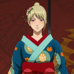 scar on cheek,pattern on kimono,wide sleeves,scar on forehead, scar on face, hakama skirt, leaf print, print kimono, long sleeves, collarbone, hair bun, floral print, purple eyes, jewelry, hair flower, earrings, sash,scar,Tsukuyo,kimono,japanese clothes,hair stick,hair_ornament,blonde_hair,blue_kimono