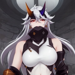 scarf,single thighhigh,boots,japanese armor,leotard,mask,gauntlets,ar,armor,red eyes,hair between eyes,messy hair,earrings,gloves,navel,horns,bare shoulders,1girl,white hair