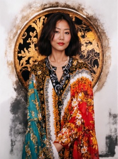 masterpiece,best quality,4k,highly detailed, award winning artwork,splash ink style,splash ink,ink splattered,ink splatter effects,ink wash painting background,brunette woman in gold dress, in the style of eye-catching resin jewelry, dark silver and dark red, calm and serene beauty, light emerald and light black, dreamy and romantic, light red and dark black, classic elegance,Above the image, there is an artistic font that reads' SUNSHINE '