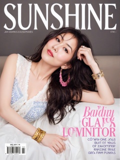 A magazine cover with a woman laying on a bed. The woman is wearing a white dress and a gold bracelet. Her hair is long and black. Her earrings are pink and yellow. The bed she is laying on is white. The text on the cover is written SUNSHINE. The image attracts the audience with cinematic camera movements and extreme skin texture details.