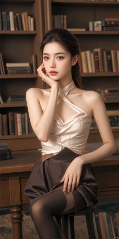 An intellectual beauty, her white halter top highlights her elegance. She wears black silk stockings and a mid-length skirt. She sits quietly at the desk in the library, resting her chin on her hand in deep thought.