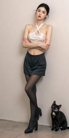 The cold beauty, with neat short hair, was wearing a white halter top and black stockings with a short skirt. She crossed her arms and leaned against the wall gracefully. Next to her squatted a black cat with a Halloween ghost face.