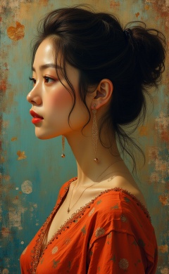 Asian girl, A beautiful woman, side profile, in the style of Marc Chagall (a meticulously detailed masterpiece, of the best quality), captured with a Samsung Galaxy, Rembrandt-style lighting.