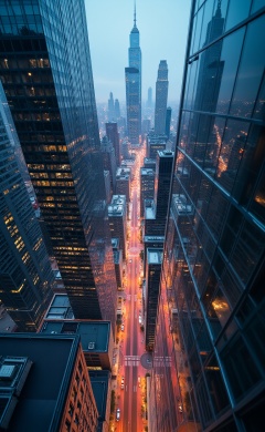 Macro lens, top-down view, bird's-eye view, from the sky, the city's architectural complex is composed of high-rise buildings made of transparent glass, with orange and pink light on the borders, commercial photography, high-definition image quality, and a shift axis lens. microspur