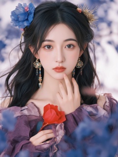 Fujifilm\(hubggirl)\, A mystical Chinese beauty stands solo, gazing directly at the viewer. Her piercing blue eyes sparkle under a cascade of black hair adorned with a hair ornament and tassel. She wears intricate jewelry, including earrings that catch the light. A stunning red flower rests on her upper body, surrounded by long sleeves with wide cuffs. Her fingernails are painted to match the red hue, and her eyelashes flutter delicately. A talisman hangs from her neck, adding to the blue theme. The model's makeup is subtle yet striking, with a focus on eyeshadow that complements her ethereal gaze.