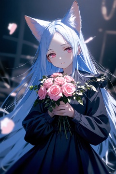 A cartoon drawing of a fox girl with long blue hair and a black dress. The fox girl is holding a bouquet of pink roses. The overall style of the image is dark, cartoon drawing,girl
