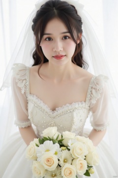 best quality, masterpiece, cowboy_shot,(Good structure), DSLR Quality,Depth of field,kind smile,looking_at_viewer,Dynamic pose, , 1girl, dreamy scene, white background, front viewer, looking at viewer, Flowers, romantic, Bride, UHD, 16k ,long hair,,floral print,kind smile,