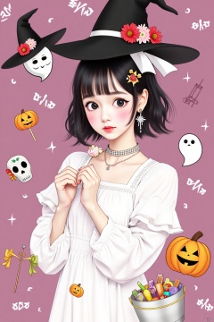 1girl, solo, looking at viewer, blush, short hair, bangs, black hair, hair ornament, long sleeves, hat, dress, holding, jewelry, upper body, flower, earrings, parted lips, food, hair flower, medium hair, white dress, black eyes, black headwear, makeup, witch hat, red flower, candy, pink flower, halloween, skull, ghost, jack-o'-lantern, red lips, witch, pumpkin, orange flower, halloween bucket