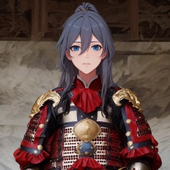 fu hua,armor,blue eyes,hair between eyes,boots,grey hair,shoulder armor,gauntlets,breastplate,ponytail,in the face,tassel,sheath,sheathed,
