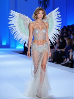 A model is walking on the runway at a fashion show. She was wearing a strapless dress adorned with beautiful wings hanging behind her, her hair cut into a fashionable bob, and her eyes focused on the left side of the picture. Her dress is decorated with exquisite patterns, adding a touch of brightness to her outfit, with a medium chest and cleavage. The background is a bright blue color with a few people on the right.