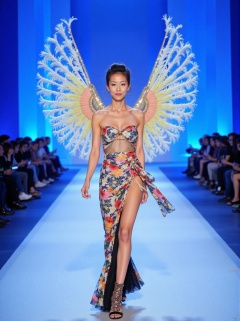 A captivating scene unfolds:35mm film,BJ_Rainbow_light,A model is walking on the runway at a fashion show. She was wearing a strapless dress with bright colors, with beautiful wings hanging behind her, her hair cut into a fashionable hairstyle, and her eyes fixed on the front of the photo. Her dress is decorated with exquisite patterns, adding a touch of brightness to her outfit, with a moderate chest and cleavage. The background is bright blue with several people on either side.