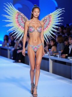 A captivating scene unfolds:35mm film,BJ_Rainbow_light,A model is walking on the runway at a fashion show. She was wearing bikini with bright colors, with beautiful wings hanging behind her, her hair cut into a fashionable hairstyle, and her eyes fixed on the front of the photo. Her dress is decorated with exquisite patterns, adding a touch of brightness to her outfit, with a moderate chest and cleavage. The background is bright blue with several people on either side.