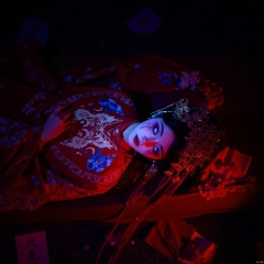 dark, Chinese Horror, Female character lying on a coffin, red wedding dress, ghost bride, fantasy horror theme, traditional dress, red and gold gown, blue flowers, ornate headdress, light makeup, dark atmosphere, mysterious, vertical composition, close-up, sharp focus, high contrast, digital art, intricate details, eerie atmosphere, pastel colors with blue and red highlights. Top angle