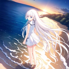 SHIROHA,(back facing viewer),(facing ocean),dawn,sun rising a little from horizon,wallpaper,from above,sand,bare_foot,wading,depth of field,((high quality)),rays,(white hair:1.13),very long_hair,((floating hair)),wind,strong rim light,night_sky