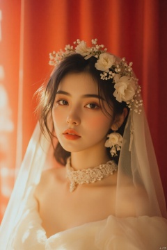 a woman dressed in a white wedding dress, adorned with a veil adorned with white flowers and pearls. Her veil is draped over her left shoulder, adding a touch of warmth to the scene. Her hair is pulled back, cascading over her shoulders, framing her face. The backdrop, a vibrant red curtain, adds a pop of color to the composition.HK film style,Wong Kar wai's film style,Vintage Hong Kong movie color scheme,OBbllai