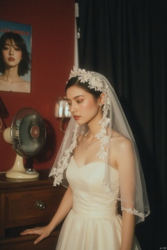 a woman dressed in a white wedding dress, adorned with a veil and a necklace. She stands in front of a wooden dresser, her left hand resting on the side of the dresser. The dresser is adorned with silver knobs, and a small white fan with a silver base, adding a touch of color to the scene. To the left of the woman, there is a red wall with a poster of a woman's face and the words "FALLEN ANGELS" on it. The backdrop is dark, with a black curtain on the right side.HK film style,Wong Kar wai's film style,Vintage Hong Kong movie color scheme,OBbllai