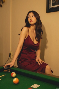 a woman with long dark hair, wearing a maroon sleeveless dress, is seated at a pool table. She is holding a white cue in her right hand, and a black remote control in her left hand. The pool table is adorned with a green cloth, adorned with billiard balls and white cards. The billiard table is set against a cream-colored wall, with a black frame hanging on the right side of the frame. A shadow of a tree can be seen in the upper left corner.HK film style,Wong Kar wai's film style,Vintage Hong Kong movie color scheme,OBbllai