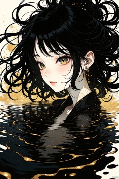 (in Otomo Katsuhiro style:1.2), high-quality, masterpiece, a womanâs face reflected in a pool of black ink, the ink swirling and distorting her features as it moves, delicate lines of gold ink tracing abstract patterns on the surface, Style is Minimalistic with surreal elements, Micro-detail ink textures, flowing liquid motion, soft reflection blur, dark ambient mood, (elaborately detailed attire with extraordinary elements:1.1), (hyperdetailed:1.1), (intricate details:1.0), (Refined details:1.1), (best quality:1.1), (high resolution:1.2)