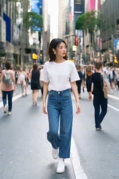 In the bustling streets of the modern city, a beautiful woman dressed in a simple white T-shirt paired with high-waisted jeans and white sneakers is casually strolling. Her hairstyle is trendy, and she wears simple silver earrings, creating an overall look that is both casual and stylish.