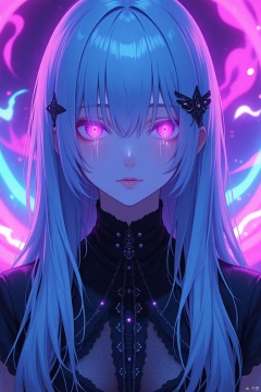 Close-up of an ethereal, pale-skinned young woman with long, straight, ice-blue hair and bangs covering her forehead. Her eyes are glowing magenta with dark, thin tears streaming down her cheeks, creating a ghostly, unsettling effect. She wears a high-neck, intricate, gothic-style black garment adorned with subtle chains, giving her a mysterious, dark allure. Background of swirling neon colors, shifting between magenta, electric blue, and deep violet, forming abstract spirals and waves that fade toward the edges. Subtle glowing symbols float among the colors, adding a hint of mysticism. Soft mist rises from the bottom, creating a dreamlike atmosphere.