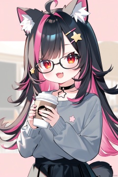 1girl, animal_ears, red_eyes, multicolored_hair, black_hair, skirt, solo, holding, ahoge, cup, disposable_cup, shirt, coffee_cup, smile, fang, holding_cup, glasses, open_mouth, looking_at_viewer, colored_inner_hair, hair_ornament, cat_ears, animal_ear_fluff, virtual_youtuber, black_skirt, star_hair_ornament, :d, pink_hair, choker, star_\(symbol\), two-tone_hair, blush