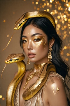 Portrait of a Western woman with tan skin, dark long hair, intense golden eyes, and a captivating beauty; close-up shot, surrealism style, adorned with gold leaf makeup, shimmering gold powder; golden python wrapped around her shoulders, luxurious gold earrings and necklace; intricate lighting, high detail, elegant and refined aesthetic.