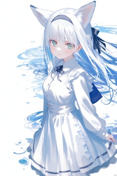 (white background:0.7), rsef, rella, konya karasue, neg_\(101neg\), vocaloid, watercolor \(medium\), 1girl, solo, green eyes, red eyes, heterochromia, fox ears, black headband, hair intakes, white hair, long hair, center frills, collared shirt, white shirt, crossed bangs, leaning back, skirt, cable, blue theme, looking at viewer, standing, ripples, aurora, digital iridescent