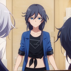 blue eyes, shirt, long hair, hair flaps, thighhighs, track jacket, short sleeves, low-tied long hair, fu hua, jacket, tied shirt, hair between eyes, low twintails, collarbone, messy hair<lora:符华-餐桌-休闲蓝:0.8>