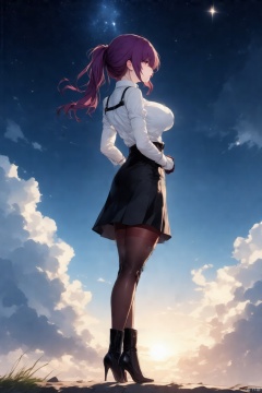 1girl, solo, long hair, breasts, bangs, skirt, large breasts, shirt, gloves, long sleeves, closed mouth, standing, full body, white shirt, ponytail, purple hair, pantyhose, red hair, boots, outdoors, sky, cloud, black skirt, black footwear, high heels, night, arms behind back, cloudy sky, star \(sky\), night sky, pencil skirt, sunset, brown pantyhose, murata himeko