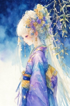 watercolor \(medium\), 1girl, solo, japanese clothes, kimono, hair ornament, long hair, upper body, profile, blush, obi, sash, painting, flower, leaf, from side, blue eyes, jewelry, earrings, blue kimono, hair flower, white hair, blonde hair, purple eyes, plant, closed mouth, star, (symbol), floral print, purple kimono, very long hair, long sleeves, looking away, print kimono, branch, blue theme, bangs, kanzashi, multicolored hair, purple flower, hair stick, yukata, autumn leaves, colorful