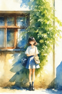 watercolor \(medium\), 1girl, solo, shirt, skirt, bag, short sleeves, white shirt, brown hair, outdoors, shoes, looking at viewer, sunlight, smile, painting, shadow, standing, bangs, building, window, long hair, pleated skirt, shoulder bag, black footwear, day, medium hair, leaf, brown eyes, closed mouth, dappled sunlight, blush, plant, blue skirt, black hair, full body, socks, tree, scenery, house, artist name, black eyes, signature, wide shot, dutch angle, summer, shade, no humans, short hair, simple background, school bag
