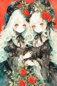 2girls, long hair, looking at viewer, flower, red flower, red background, dress, parted lips, green eyes, puffy sleeves, hat, rose, white hair, bangs, upper body, hat flower, long sleeves, red rose, red dress, juliet sleeves, bonnet, red lips, makeup, lace trim, black dress, lace, frills, black headwear, aqua eyes, siblings, heads together, ribbon, gothic, choker, twins, eyelashes, neck ribbon, wavy hair, curly hair, eyeshadow, sisters, blonde hair, lolita fashion, black ribbon, gothic lolita, jewelry, cleavage, lace choker, cross, lipstick, simple background, holding hands, breasts, red headwear